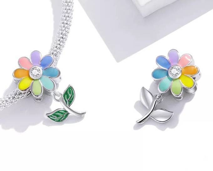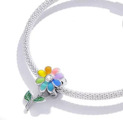 A colourful, fun daisy bracelet charm with rainbow enamel and cubic zirconia gemstone and the centre of the flower.