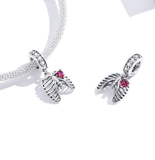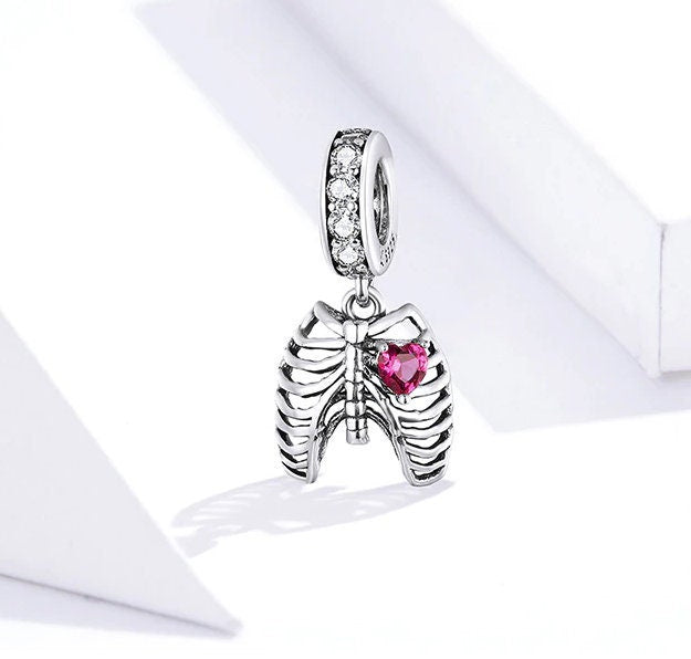Steampunk style sterling silver skeleton ribcage charm with cubic zirconia stone in red to represent the heart. This is a really striking piece and would make a wonderful gift for a friend or loved one.