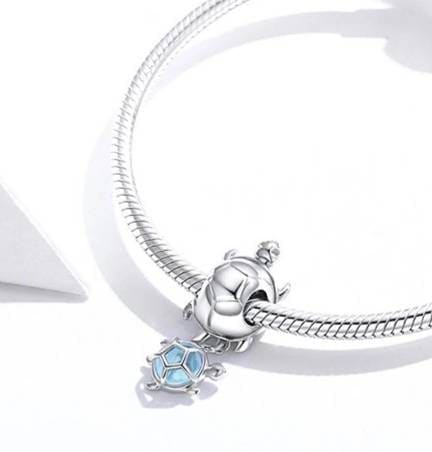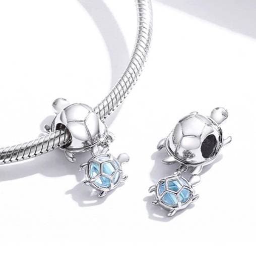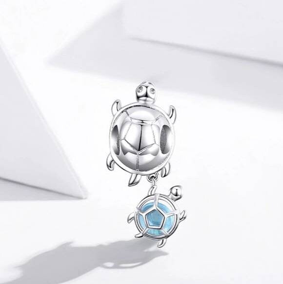 Perfect gift for mum. A cute mother and baby turtle charm in sterling silver, finished with a blue zirconia gemstone.