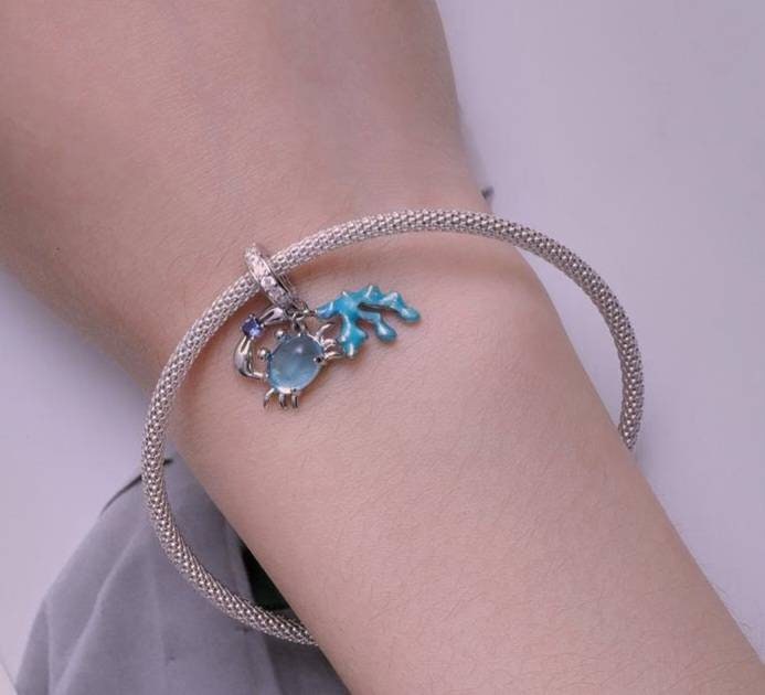 A quirky little bracelet charm for any ocean lover. Featuring a crab clutching a blue gemstone in between his claws, and a piece of sea coral. The charm band is studded with CZ gemstones for even more sparkle.