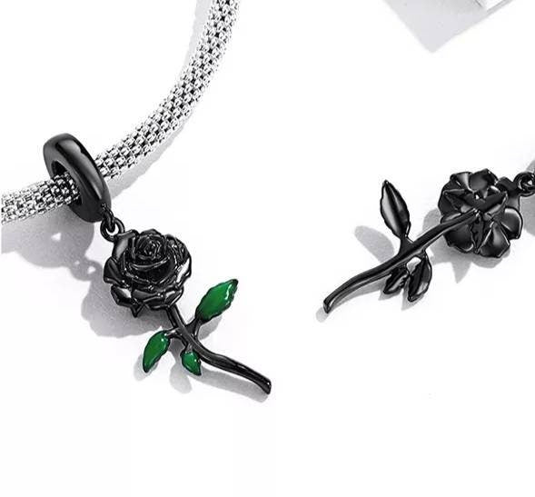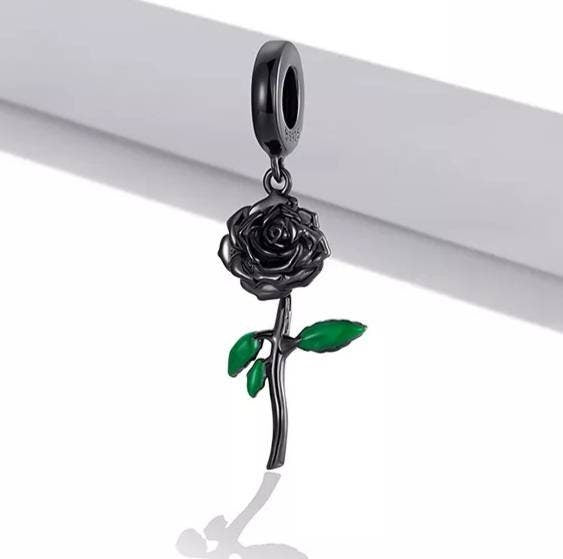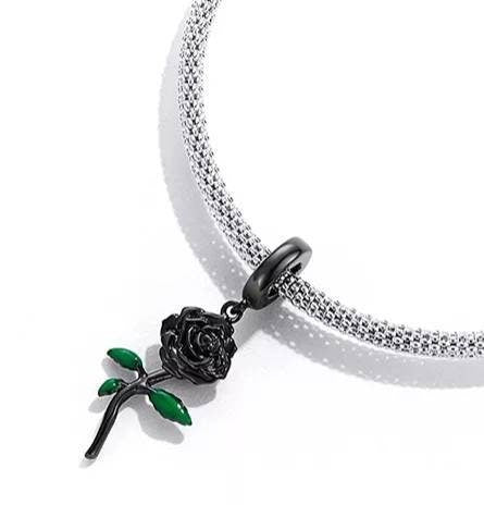A lovely, romantic style charm with a touch of gothic. A single black rose, with green enamel leaves. Perfect for your charm bracelet.