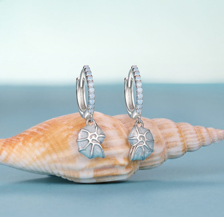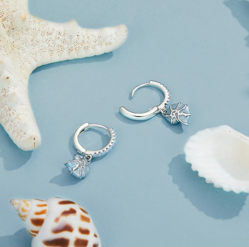 Make a splash this summer with these beautiful sterling silver huggie hoops. Studded with pale blue gemstones, and finished with dangling shell charms. Perfect for a beach holiday.