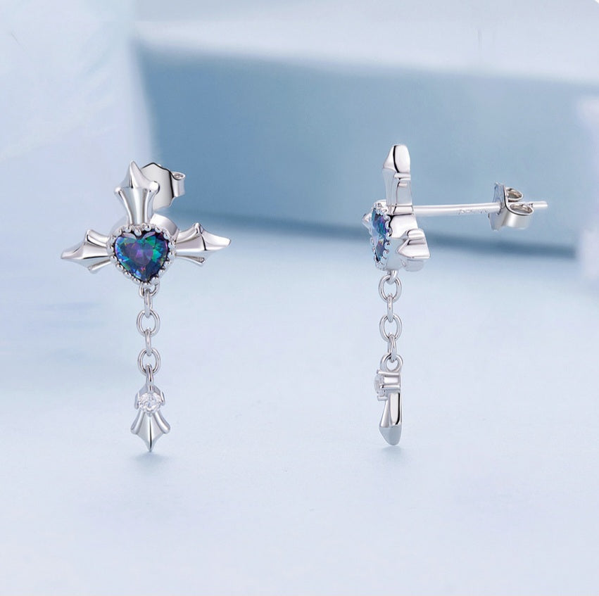 Elegance with a touch of goth glam. These pretty cross earrings are stuffed with a colourful heart gemstone at the centre, with a longer drop for a more dramatic look. Made from sterling silver with CZ gemstones.