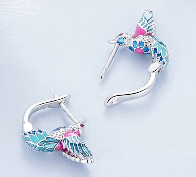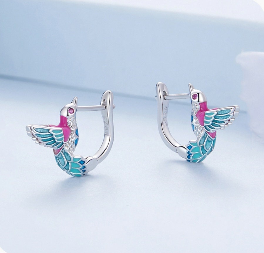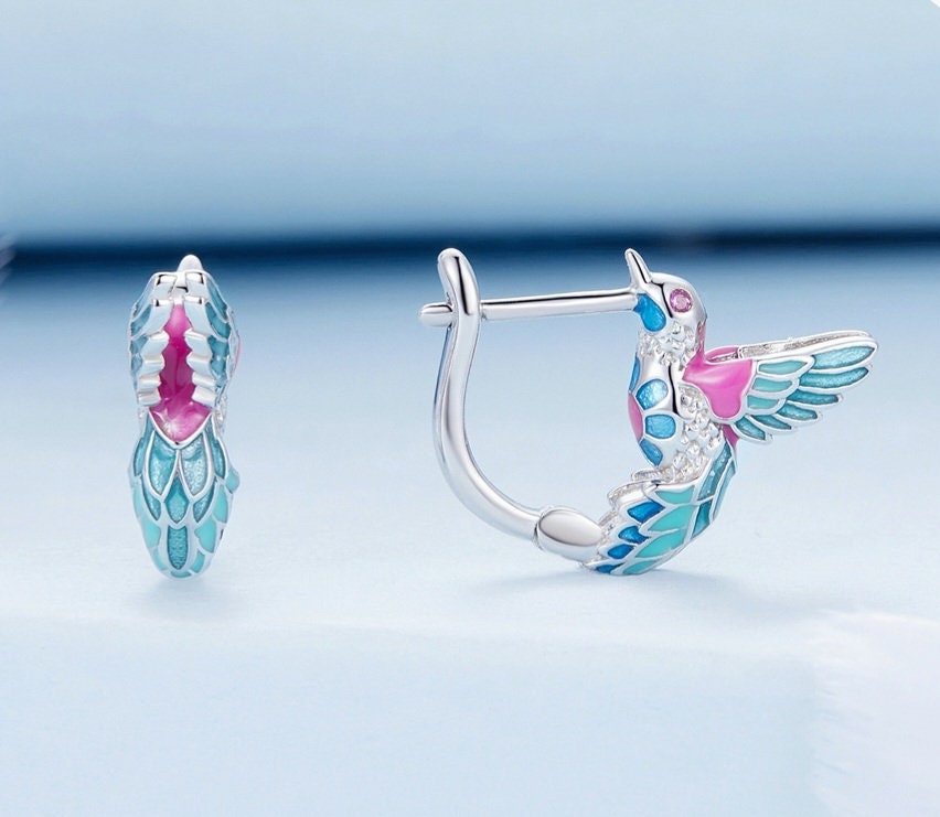 Beautiful kingfisher earrings with lever arch fastening. Huggie hoop style, these colourful birds are designed to sit close to the lobe. With brightly coloured feathers and dazzling CZ gemstones, they really are a statement pair.