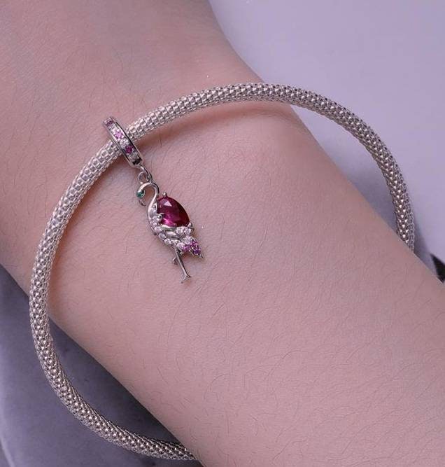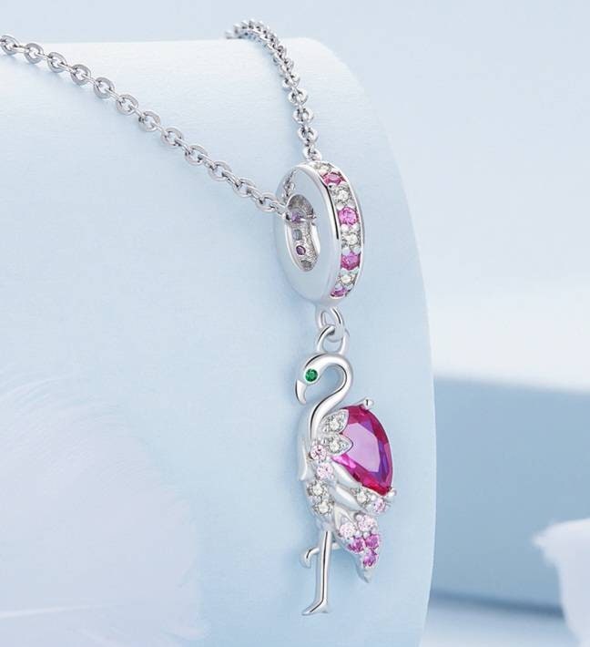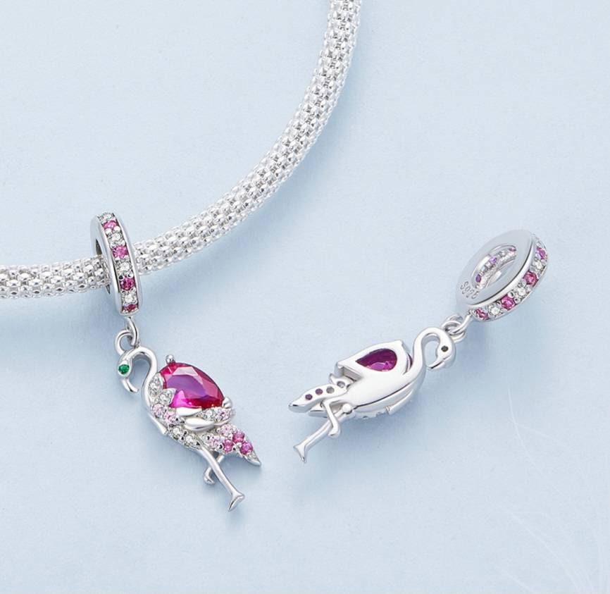 This flamingo bracelet charm is made from sterling silver and packed with light and dark pink cubic zirconia gemstones. Finished with an emerald green gemstone for the eye.