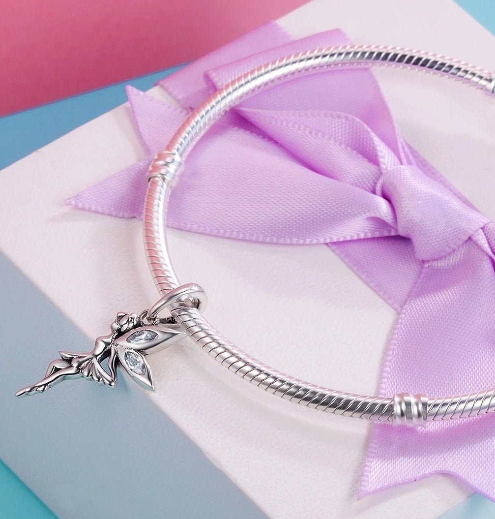 A sterling silver fairy bracelet charm, with gemstone studded wings. Pretty jewellery to dangle from your wrist.