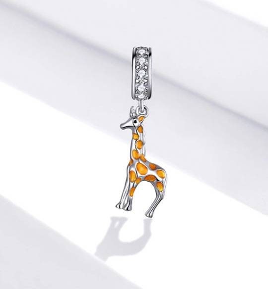 A sterling silver charm in the shape of a giraffe with coloured enamel detail, suitable for a wide range of bracelet brands including Pandora. Finished with a cubic zirconia gemstone band.