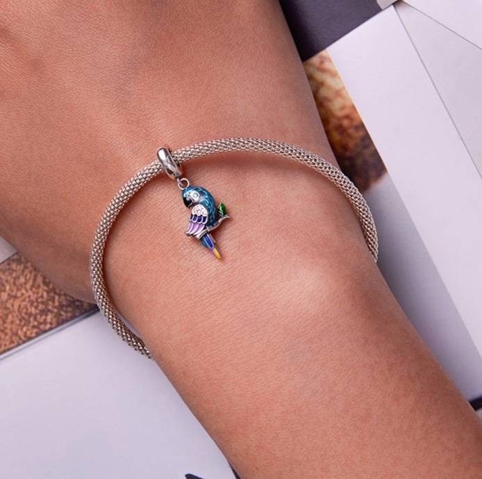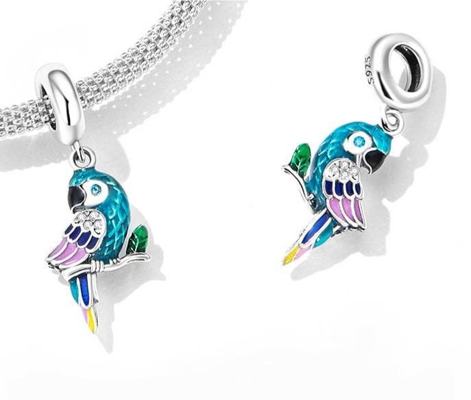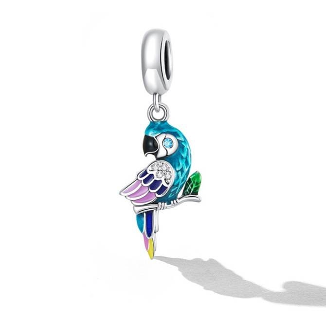 Colourful parrot dangle charm that fits both Pandora and Chamilia bracelets. Crafted from sterling silver, the charm is approx 2.7cm in length and f inished with coloured enamel and cubic zirconia gemstones.