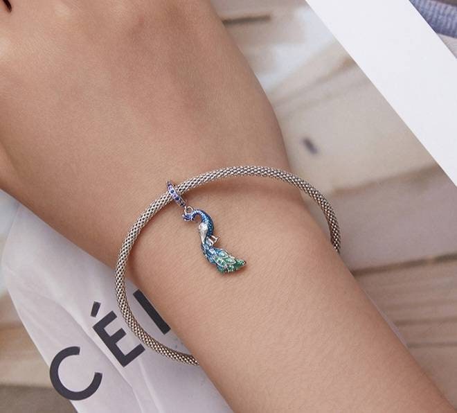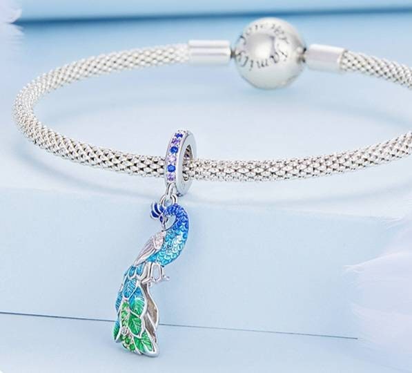 A truly exquisite bracelet charm. The peacock has textured enamels in greens and blues. with tiny gemstones studding the feathers. The band is also decorated with blue cubic zirconia gemstones, the more ethical choice yet still sparkling like true diamonds.
