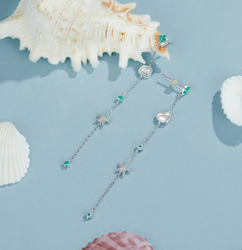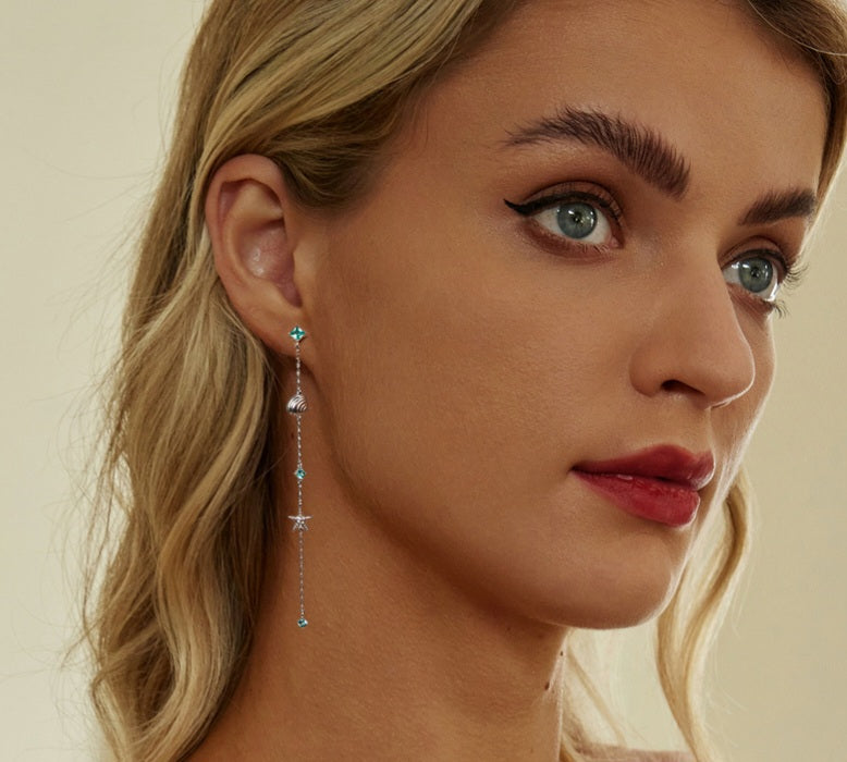 A beautiful pair of statement earrings, perfect summer evenings or a beach wedding. Made from sterling silver, they are studded with aqua gemstones, silver clam shells and starfish. Drop earrings are incredibly flattering as they add the illusion of length to the face.